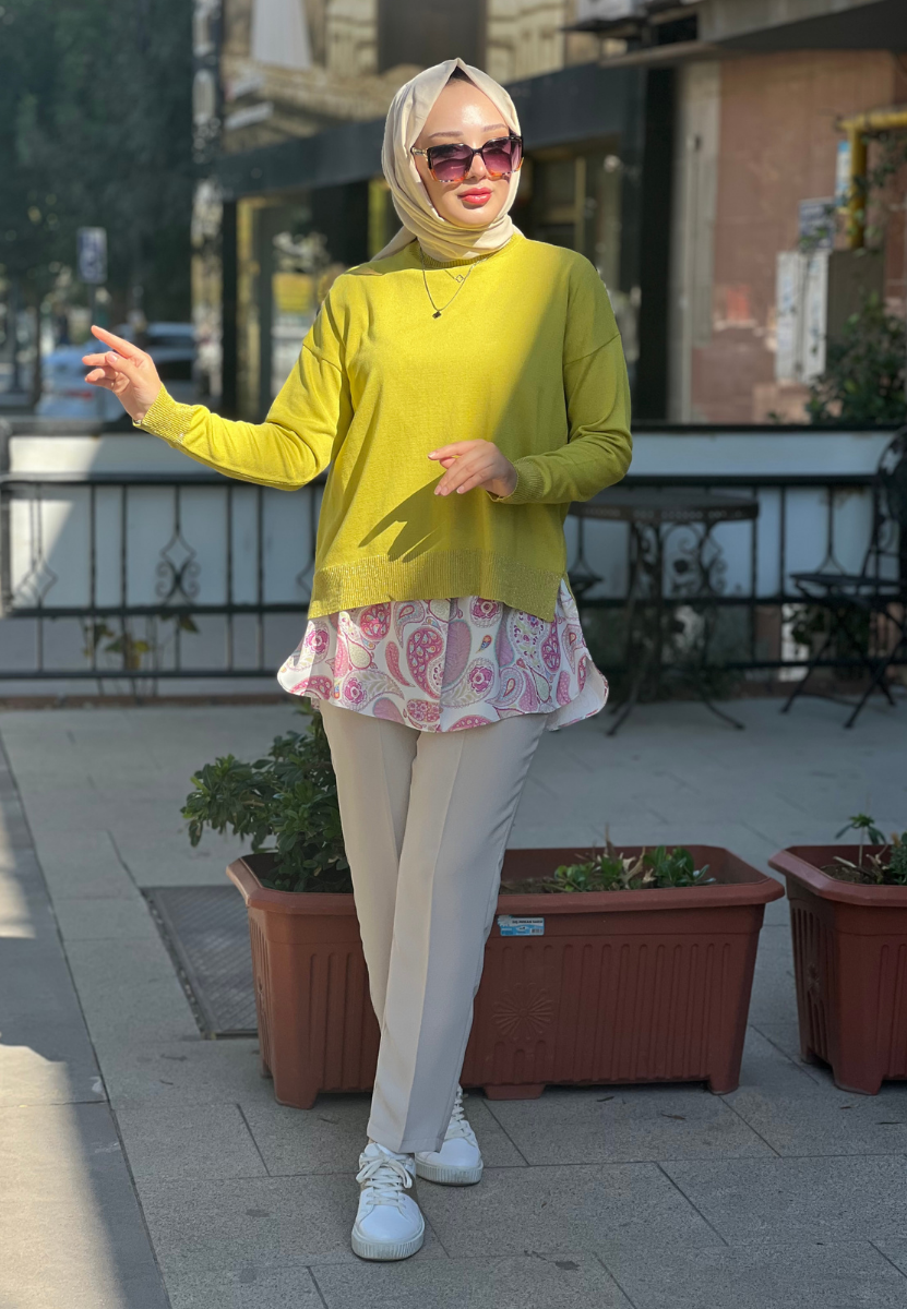Yağ Yeşili Krep İçlikli Triko Tunik